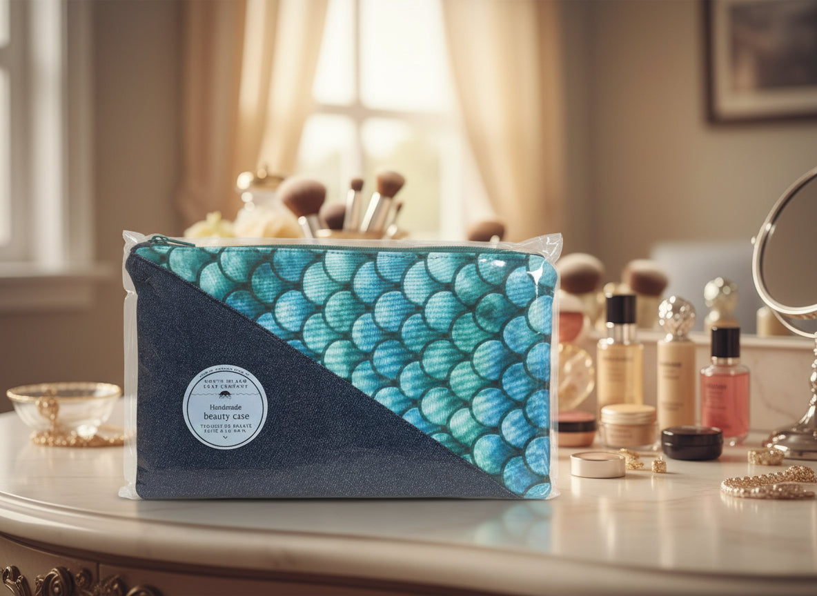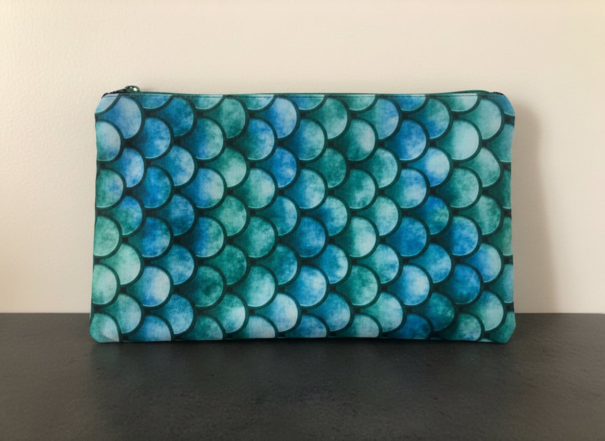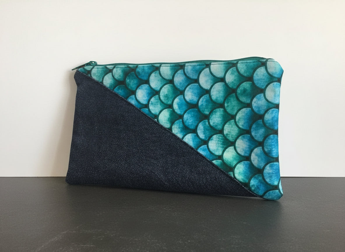 Mermaid & Denim, approximately 9-1/2" x 6", with an easy slide acrylic zipper.